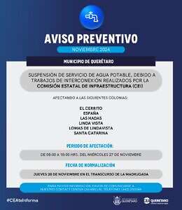 Se suspenderá el servicio de agua potable en 6 colonias de la capital queretana, debido a trabajos de interconexión realizado por el CEI; la interrupción iniciará mañana y se normalizará el jueves 28 de noviembre