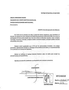 Luego de 16 años de militancia en el PRI, Juan Pablo Mayorga anunció su renuncia al tricolor y manifestó su agradecimiento; dejó la Secretaría de Vinculación Empresarial y Emprendimiento del Comité Directivo Estatal del partido