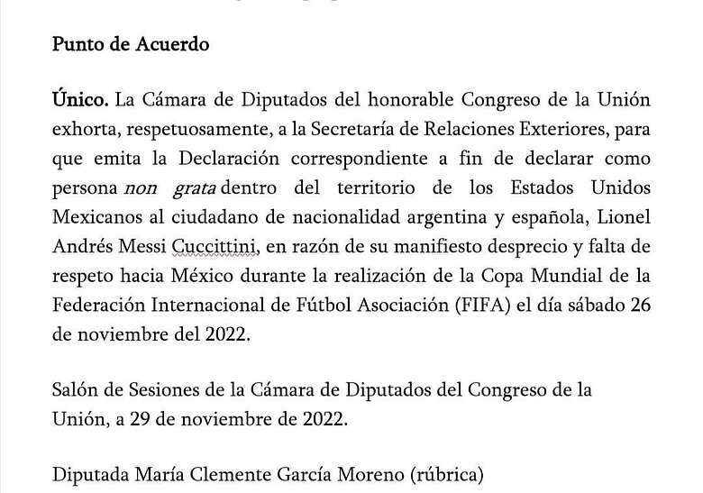 "Con punto de acuerdo, para exhortar a la SRE (Secretaría de Relaciones Exteriores de México) a declarar como persona non grata al ciudadano de nacionalidad argentina y española Lionel Andrés Messi Cuccittini", se lee la